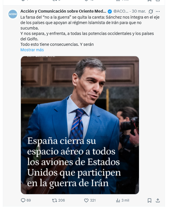 El debate sobre ACOM no se limita al ámbito jurídico. Varias informaciones periodísticas han señalado su proximidad a sectores del Partido Popular y Vox, especialmente en lo relativo a la política exterior y la defensa de Israel.