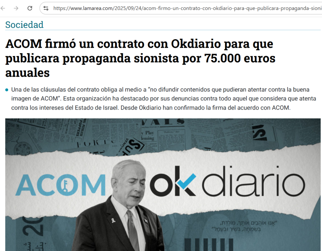 ACOM firmó un contrato con Okdiario para que publicara propaganda sionista por 75.000 euros anuales