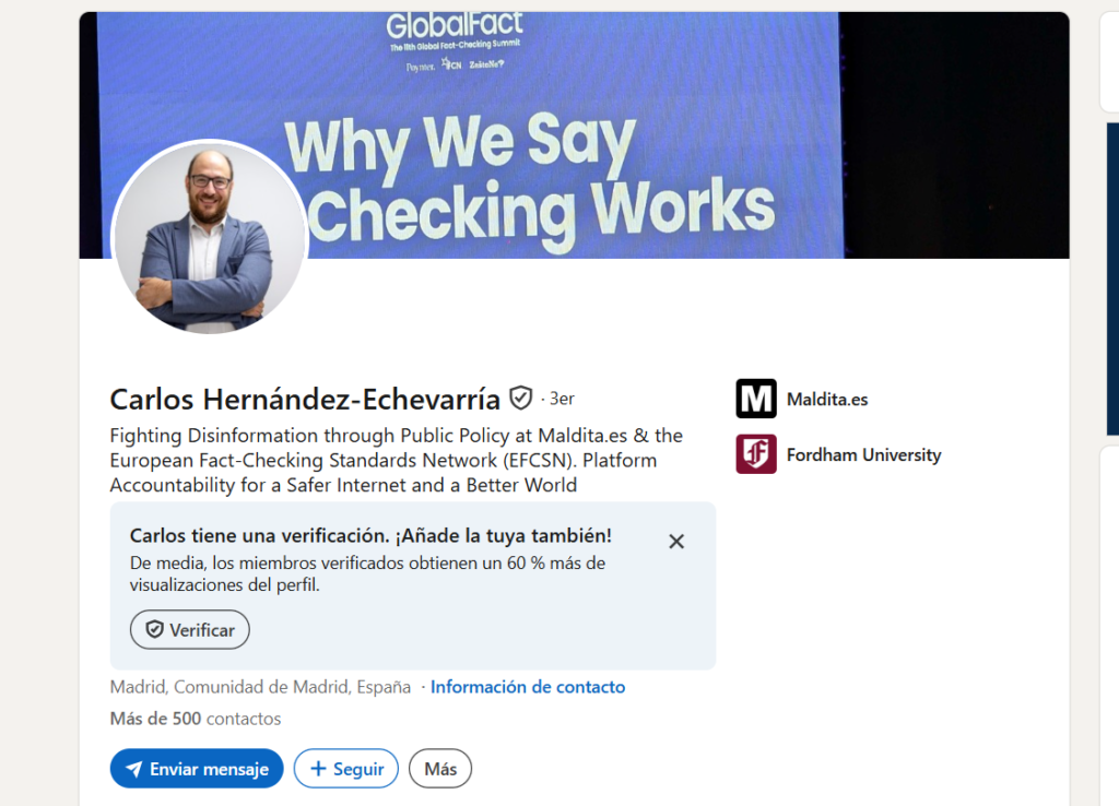 No se trata, por tanto, de una figura periférica, sino de un perfil con presencia en varios niveles del ecosistema informativo. Ese cruce de planos se aprecia también en el ámbito europeo. La propia Maldita señala que Jiménez forma parte de la gobernanza del European Fact-Checking Standards Network (EFCSN), del que la fundación es miembro fundador. Este tipo de posiciones implica participar no solo en la actividad de verificación, sino también en espacios donde se definen estándares, se coordinan redes y se articulan dinámicas del sector.