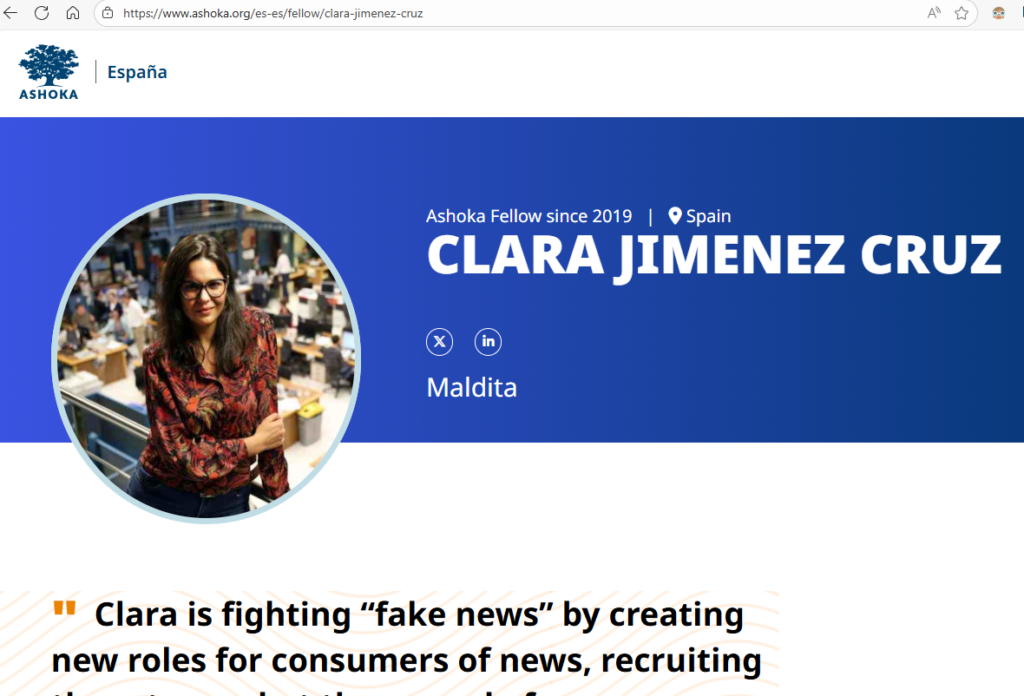 En paralelo, la trayectoria de Jiménez incluye su reconocimiento como Ashoka Fellow desde 2019, dentro de una red internacional centrada en el emprendimiento social y la promoción de iniciativas con impacto cívico. Desde esa perspectiva, Maldita se presenta no solo como un medio, sino también como un proyecto orientado a la alfabetización mediática y a la intervención en el espacio informativo.Este tipo de redes no operan desde una neutralidad estricta, sino que seleccionan y apoyan proyectos alineados con marcos conceptuales concretos. En la práctica, esto puede favorecer una cierta convergencia de enfoques, donde iniciativas distintas terminan moviéndose dentro de un mismo perímetro de actuación.