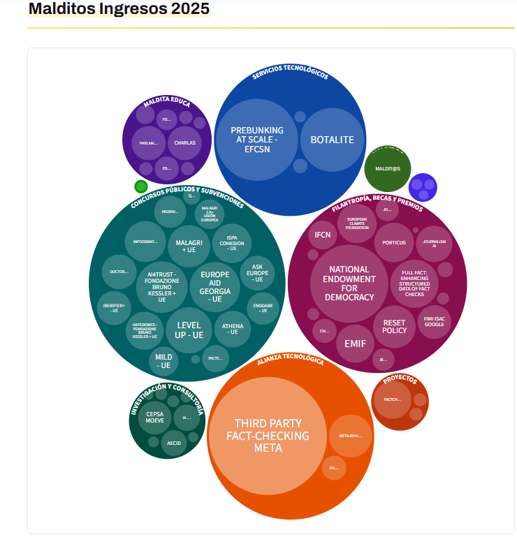 Las valoraciones incluidas forman parte del análisis periodístico y deben entenderse como tales.La información económica utilizada en este artículo procede, fundamentalmente, de las cuentas anuales y documentación pública de la Fundación Maldita, así como de fuentes accesibles y verificables. No obstante, debido al tratamiento, agregación e interpretación de dichos datos, podrían existir errores materiales, imprecisiones o diferencias respecto a otras posibles lecturas de la misma información.