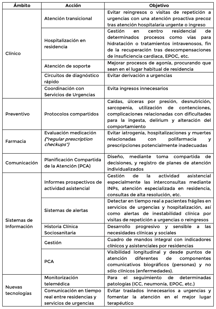 - Sistemas de información. Se busca la intercomunicabilidad, evitando el aislamiento actual de las herramientas informáticas sanitaria y residencial. También se trata de establecer escalas clínicas, parámetros e indicadores comunes.