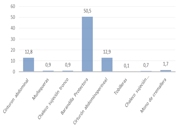 Además, se observó (Gráfico 2) que existía una elevada prevalencia de uso de contenciones. Se utilizaban excesivamente medicamentos con efectos depresores del sistema nervioso central (un 69 % de ansiolíticos y un 33,2 % de neurolépticos) y existía elevada prevalencia de polifarmacia (el 21,6 % recibía entre diez y quince fármacos y el 8,4 %, más de quince).