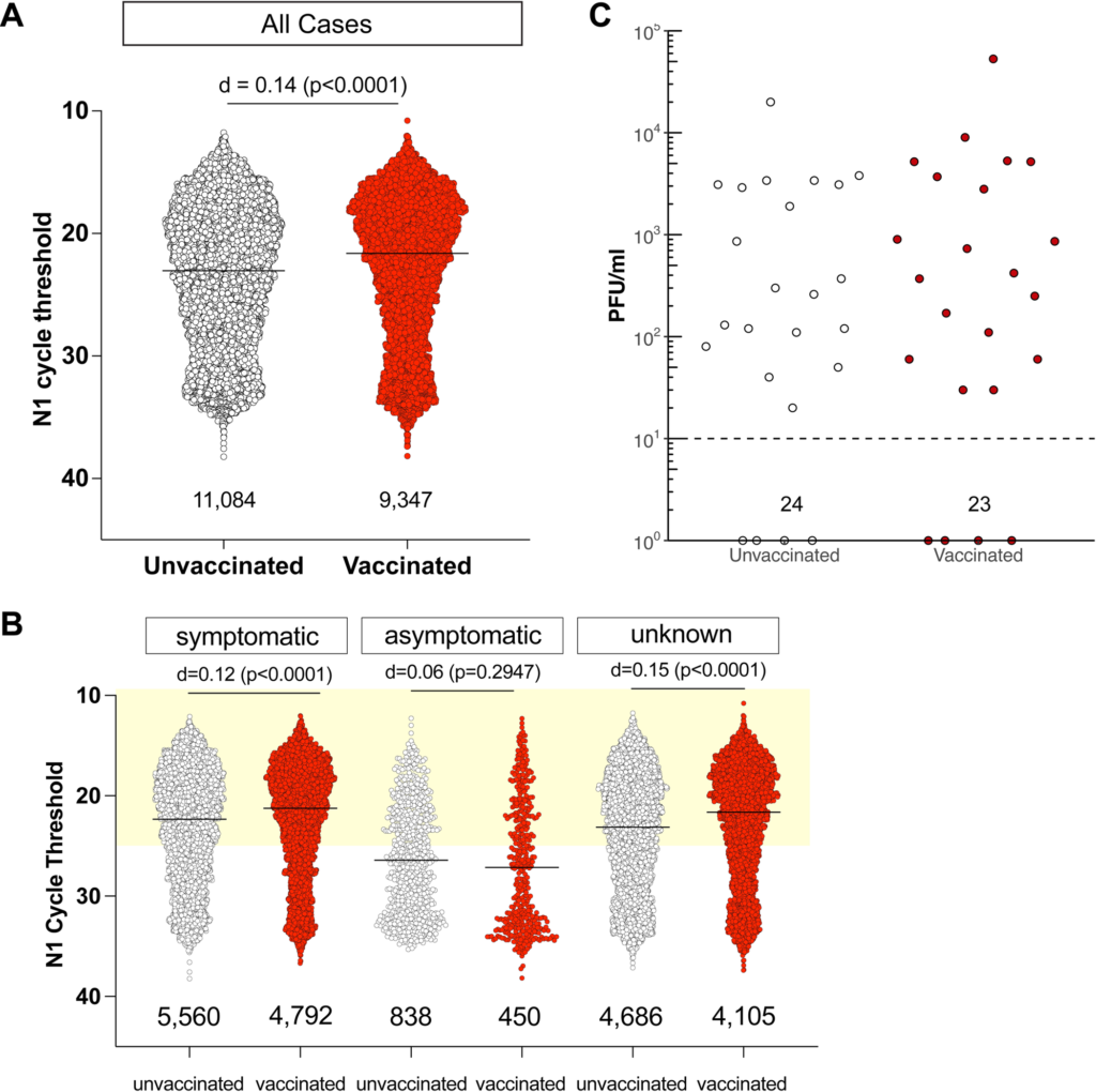La variante Delta del SARS-CoV-2, motivo de preocupación, es altamente transmisible y contiene mutaciones que le confieren un escape inmunitario parcial. La aparición de la variante Delta en Norteamérica provocó el primer aumento repentino de casos de COVID-19 tras la amplia disponibilidad de las vacunas contra el SARS-CoV-2. Para determinar si las personas infectadas a pesar de la vacunación podrían transmitir el SARS-CoV-2, comparamos los datos del umbral de ciclo (Ct) de RT-PCR de 20.431 muestras de hisopado nasal anterior con resultado positivo de personas completamente vacunadas (n = 9.347) o no vacunadas (n = 11.084), analizadas en un único laboratorio comercial durante el intervalo del 28 de junio al 1 de diciembre de 2021, cuando predominaban las variantes Delta. No observamos ningún efecto significativo del estado de vacunación por sí solo sobre el valor de Ct, ni al controlar por el producto vacunal o el sexo. Al analizar un subconjunto de muestras con un Ct bajo (<25), detectamos virus infeccioso con tasas y títulos similares en muestras de personas vacunadas y no vacunadas. Estos datos indican que las personas vacunadas infectadas con variantes Delta son capaces de eliminar el SARS-CoV-2 infeccioso y podrían desempeñar un papel en la propagación de la COVID-19.