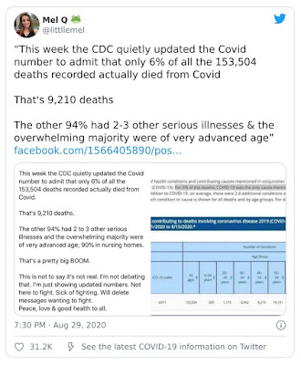 Entonces, si cree en este número de los CDC, que dudo mucho porque es demasiado do alto, de las 843,885 muertes en todo el mundo, solo 50,633 se pueden contar como muertes puras por Corona en SEIS MESES.