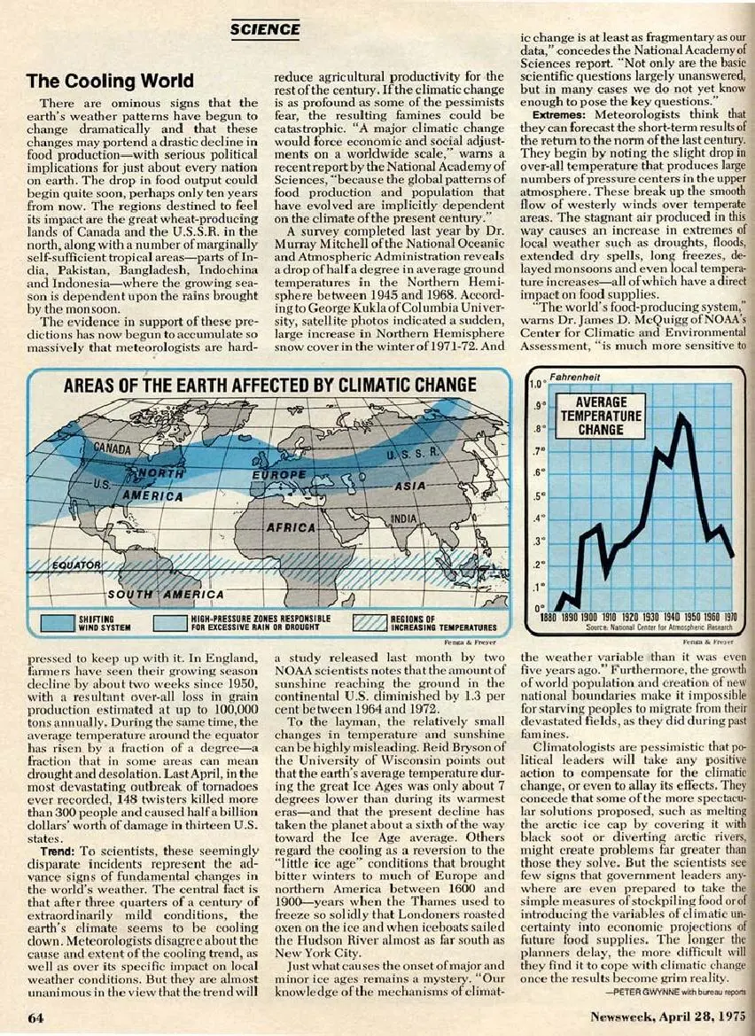 La fiesta finmundista glaciar se llevó hasta el Informe de la Academia Nacional de Ciencias de EE. UU./Consejo Nacional de Investigación de 1975. Decenas de artículos similares, todos firmados por reputados expertos del clima y algunos con predicciones aún más nefastas de una «pequeña edad de hielo» por venir, aparecieron durante la década de 1970 en publicaciones tan importantes como Time, Science Digest , The Los Angeles Times, Fortune, The Chicago Tribune , New York Magazine , The New York Times, The Christian Science Monitor, Popular Science y National Geographic: