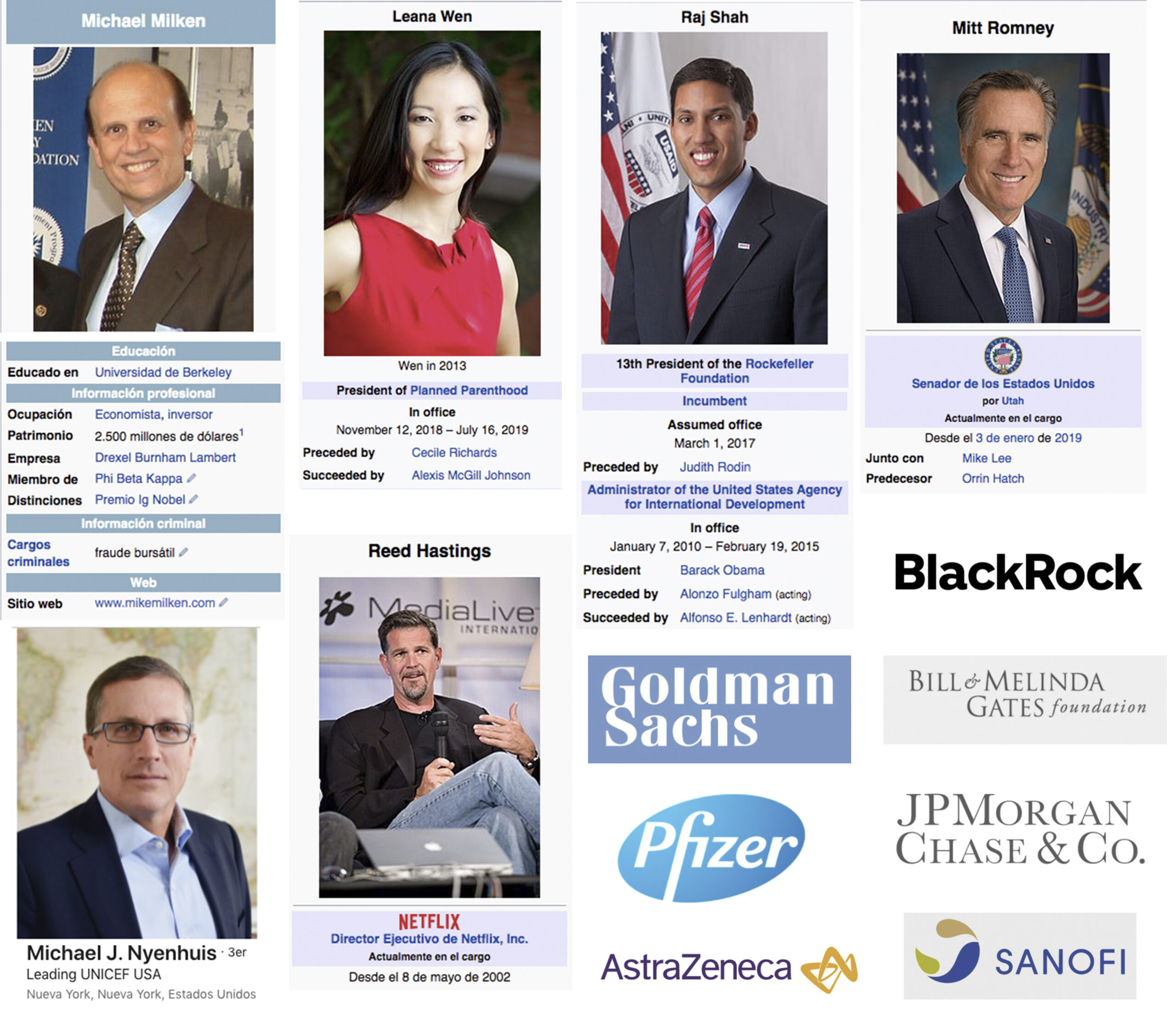 BlackRock | Goldman Sachs | JP Morgan | Fundación Rockefeller | Fundación Bill & Melinda Gates | Fundación Ford | General Motors | Takeda Pharmaceuticals | Pfizer | Novartis | Sanofi | AstraZeneca | Royalty Pharma | Wells Fargo