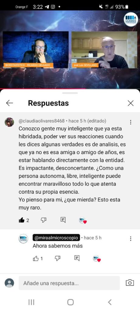 En el siguiente fragmento de vídeo, Ricardo Delgado y el doctor José Luis Sevillano entrevistan a una persona que refiere haber padecido agorafobia. Durante la conversación, podría interpretarse que se vincula su enfermedad con lo que ellos denominan el “Factor E”, es decir, energías malignas. Este contenido corresponde al Programa 33 de La disidencia del misterio, emitido en YouTube el 13 de agosto de 2025 (hora 2:23:00). En cualquier caso, recomendamos que los lectores consulten directamente el vídeo y extraigan sus propias conclusiones. Hay que indicar que el programa se anunció como testimonios de personas que hayan convivido con personas que sospechen que están hibridadas.