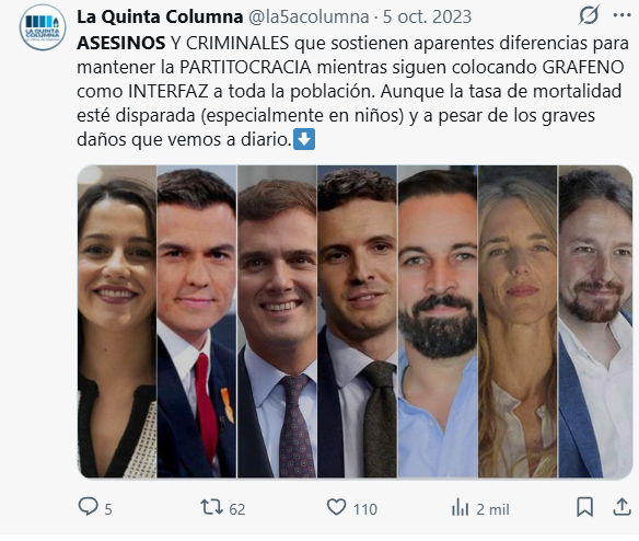 La Quinta Columna se ha presentado como uno de los principales difusores de una teoría que atribuye al grafeno la causa de numerosas enfermedades, especialmente en relación con los efectos de las llamadas vacunas contra la COVID-19. Según esta narrativa, dicho material sería introducido en el organismo por diversas vías con el supuesto objetivo de modularnos mediante radiofrecuencia y, en última instancia, transformarnos en “humanoides” al servicio de una élite. El grupo reúne a miles de seguidores que diariamente siguen sus transmisiones en directo a través de internet. Diversos críticos y observadores han llegado a clasificar a este colectivo como un movimiento coercitivo Fuente Fuente Fuente Fuente Fuente Fuente Fuente Fuente Fuente Fuente Fuente Ante esto, nos preguntamos si los rasgos comunes entre los movimiento coercitivo podrían aplicarse también a La Quinta Columna. Aunque lo planteamos únicamente como una reflexión, de un análisis en profundidad podría deducirse que comparte varios de esos rasgos. En todo caso, dejamos abierta la cuestión para que el lector, en base a sus propios conocimientos y criterio, extraiga sus propias conclusiones.