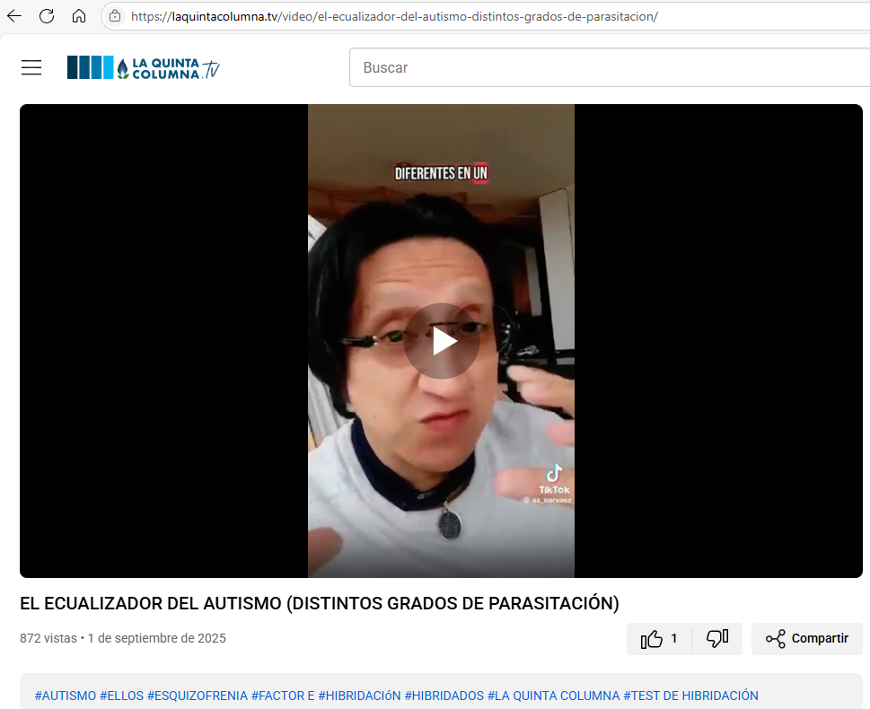 Según su narrativa espiritual/esotérica, en el siguiente vídeo podría entenderse que se plantea el controvertido debate sobre la supuesta hibridación o parasitación de personas que muestran comportamientos inusuales, posibles trastornos mentales o actitudes calificadas como inmorales. Les recomendamos ver el vídeo para realizar su propia interpretación: