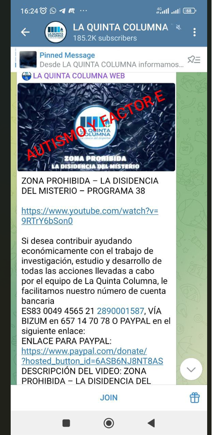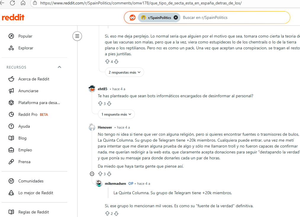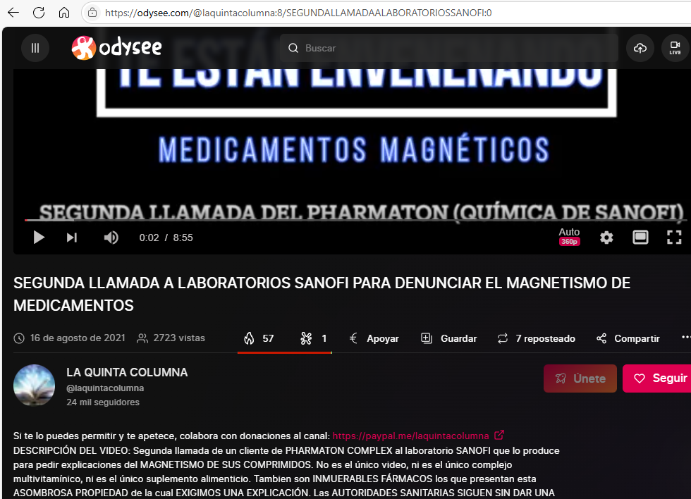 5. Otra característica destacada en la dinámica de La Quinta Columna es el aislamiento de sus seguidores frente a visiones alternativas. Se percibe un rechazo hacia quienes no comparten su cosmovisión. Por ejemplo, cualquier intento de analizar los efectos adversos de los componentes declarados en las vacunas o de cuestionar el trato dado a los ancianos durante la pandemia es descartado si no se ajusta a su narrativa sobre el grafeno. El grupo se presenta como poseedor de una “pretensión de exclusividad de la información”, que refuerza mediante episodios como el fenómeno de la supuesta adherencia de cucharas y otros objetos a la piel, aun cuando tales afirmaciones contradicen las leyes de la física y la ciencia médica conocida. Este patrón es consistente con dinámicas de grupos cerrados descritas en psicología social (sesgo de confirmación, cámaras de eco).
