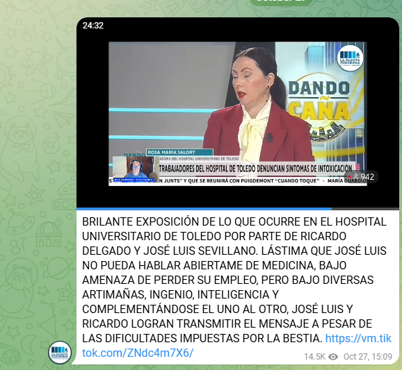 Ricardo y el doctor Sevillano analizan una intoxicación producida en el hospital de Toledo. En el post publicado en el canal de Telegram de LQC, se indica: «brilante exposición de lo que ocurre en el hospital universitario de toledo por parte de ricardo delgado y josé luis sevillano. lástima que josé luis no pueda hablar abiertame de medicina, bajo amenaza de perder su empleo, pero bajo diversas artimañas, ingenio, inteligencia y complementándose el uno al otro, josé luis y ricardo logran transmitir el mensaje a pesar de las dificultades impuestas por la bestia.»