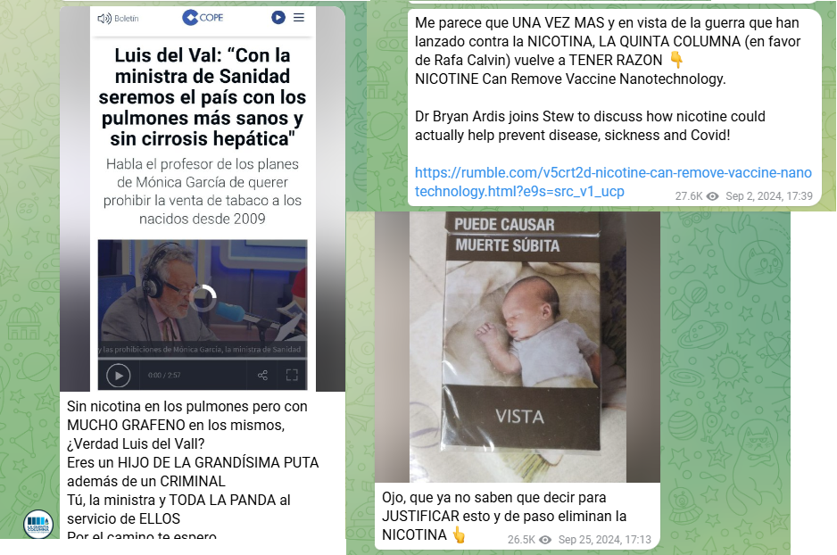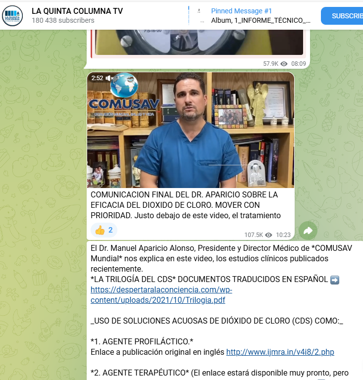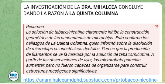 12. Muchos grupos coercitivos suelen presentar “soluciones o explicaciones alternativas” a enfermedades reales o inventadas, como medicamentos, terapias o suplementos sin validación científica. Estos productos se ofrecen como “curas secretas” o descubrimientos exclusivos del grupo. Los miembros, en su búsqueda de respuestas al malestar, pueden mostrarse más vulnerables a aceptar tales propuestas sin cuestionarlas. En el caso de La Quinta Columna, se han difundido mensajes en los que se sugería, por ejemplo, que la nicotina podría eliminar el grafeno, que la dexametasona reduciría su supuesta toxicidad, o que la denominada “técnica de depuración magneto-térmica Sevillano-Delgado” serviría para separar grafeno de un inóculo, todo ello en relación a lo que identifican como síndrome de radiación aguda ( teoría ambiental de la Covid-19). Hasta donde alcanza nuestro conocimiento, no existe constancia científica que avale estas afirmaciones ni evidencia comprobada que respalde dichas hipótesis dentro del contexto de la pandemia declarada y su teoría ambiental de origen de la Covid-19. Tienen las siguientes capturas de pantalla para examinar los hechos y valorarlos. En todo caso, antes de sacar cualquier conclusión, les recomendamos leer las publicaciones originales completas o posts en su canal de telegram.
