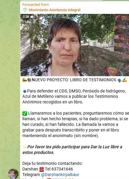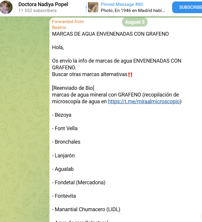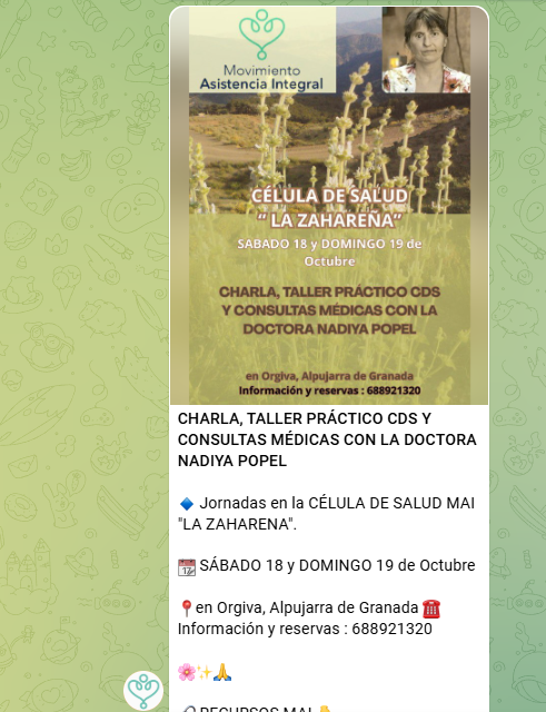 Otra de las difusoras de la teoría del grafeno más conocida es la doctora Nadiya Popel. En sus canales se puede encontrar contenido relacionado con el grafeno, terapias naturales y testimonios sobre el uso del CDS. Ha creado un colectivo llamado Movimiento Asistencia Integral, que, según su propia página web, está registrado a su nombre. Entre sus colaboradores figura Josep Pàmies. Este movimiento organiza cursos, comercializa productos y solicita donaciones. Además, en sus foros de Telegram es frecuente encontrar conversaciones relacionadas con el CDS.