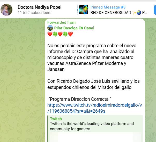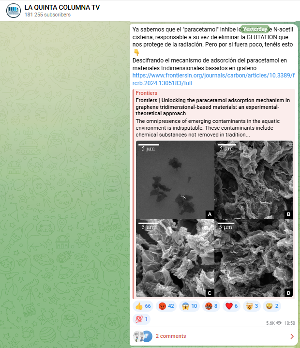 El 20 de noviembre de 2025 se publico un post en su canal de Telegram en el que se puede entender que el paracetamol inhibe los niveles de N-acetil cisteína, responsable a su vez de eliminar la GLUTATION que nos protege de la radiación, en base a un articulo científico. El artículo no confirma esa idea: el paracetamol no inhibe la N-acetil cisteína, y aunque puede consumir algo de glutatión, esto no prueba que reduzca una supuesta protección frente a la radiación.