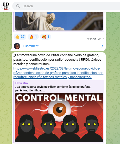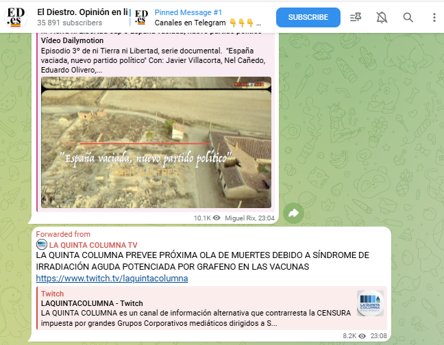 9. En sus canales ejercen un fuerte control sobre la información que llega a los seguidores. Se ha difundido la idea de que la mayoría de los demás grupos disidentes serían en realidad “disidencia controlada”, y que quienes habrían trabajado para el “enemigo” pagarían por sus actos con la muerte. En estos espacios no suelen aparecer menciones a teorías alternativas que pudieran ser compatibles con sus planteamientos. Aparentemente, se presentan como los únicos poseedores de la verdad, mientras que sus críticos son descritos como colaboradores de ese supuesto enemigo que busca ocultarla.