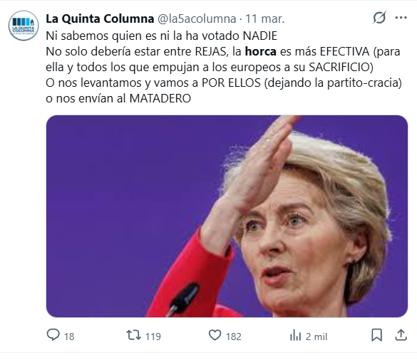A través de un canal en redes sociales denominado “A por ellos”, vinculado en distintas publicaciones a La Quinta Columna, se difundieron mensajes en los que se animaba a los seguidores a denunciar de manera masiva cuentas de Twitter consideradas contrarias a sus creencias.