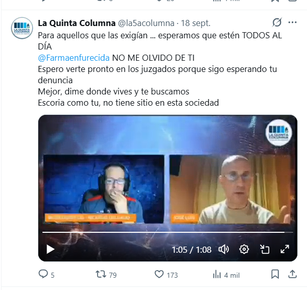 Se recomienda visualizar el vídeo completo para una adecuada comprensión del contexto. Para una valoración precisa, nos remitimos íntegramente a las declaraciones recogidas en el propio contenido. En el mensaje difundido por La Quinta Columna se emplean expresiones como: “…pueden tomar esto como una amenaza…”, “…vamos a ir directamente a por todos ustedes…” o “…ustedes son una panda de asesinos y criminales…”.