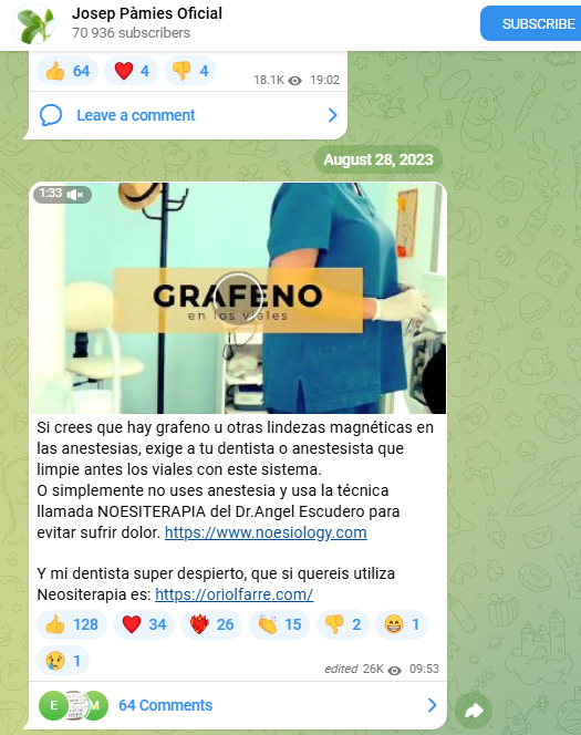 En uno de sus vídeos se presentó lo que denominaron la “técnica magneto-térmica Sevillano-Delgado”, supuestamente orientada a separar grafeno de la anestesia odontológica. En ese mismo contexto, se difundió públicamente un listado de clínicas odontológicas en las que, según afirmaban, se aplicaría esta práctica. Hasta donde alcanza nuestro conocimiento, no existe evidencia científica que respalde la eficacia de dicha técnica ni hemos encontrado estudios que lo respalden.