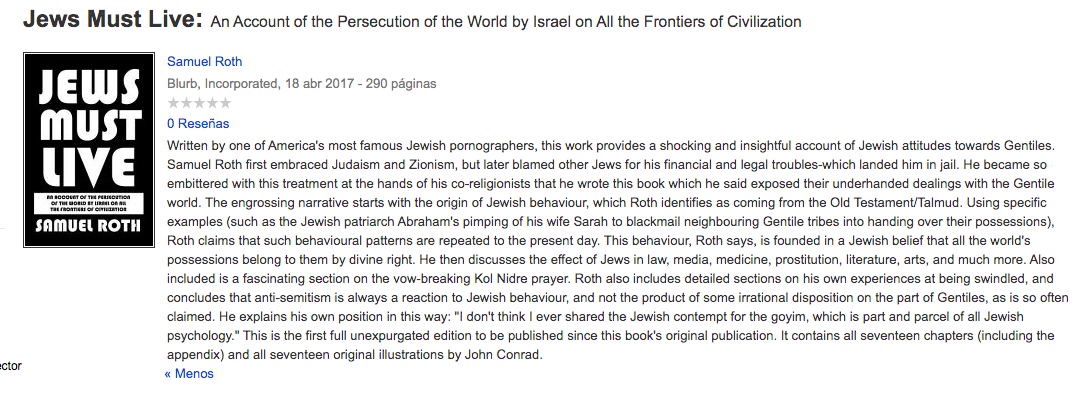 La fascinante narración comienza con el origen del comportamiento judío, que Roth identifica como proveniente del Antiguo Testamento / Talmud. Este comportamiento, dice Roth, se basa en la creencia judía de que todas las posesiones del mundo les pertenecen por derecho divino. Luego analiza el efecto de los judíos en la ley, los medios de comunicación, la medicina, la prostitución, la literatura, las artes y mucho más. Explica su propia posición de esta manera: «No creo que haya compartido nunca el desprecio judío por los goyim, que es parte integral de toda la psicología judía». Esta es la primera edición completa sin censura que se publica desde la publicación original de este libro.