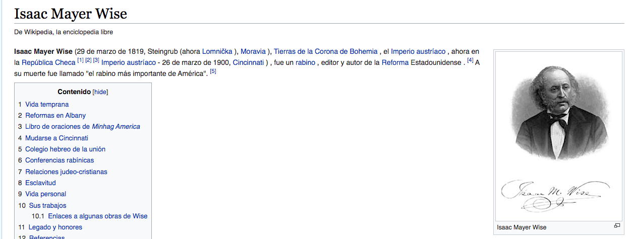 Isaac Mayer Wise (29 de marzo de 1819, Steingrub Moravia – 26 de marzo de 1900, Cincinnati ) fue un rabino , editor y autor de la Reforma Estadounidense. A su muerte fue llamado «el rabino más importante de América». Hijo de Leo Weis, un maestro de escuela, Isaac recibió su educación hebrea temprana de su padre y abuelo, y luego continuó sus estudios seculares y hebreos en Praga. En 1843 fue nombrado rabino en Radnitz, Bohemia , donde permaneció unos dos años. En 1846 Weis emigró a los Estados Unidos y cambió la ortografía de su apellido a Wise.