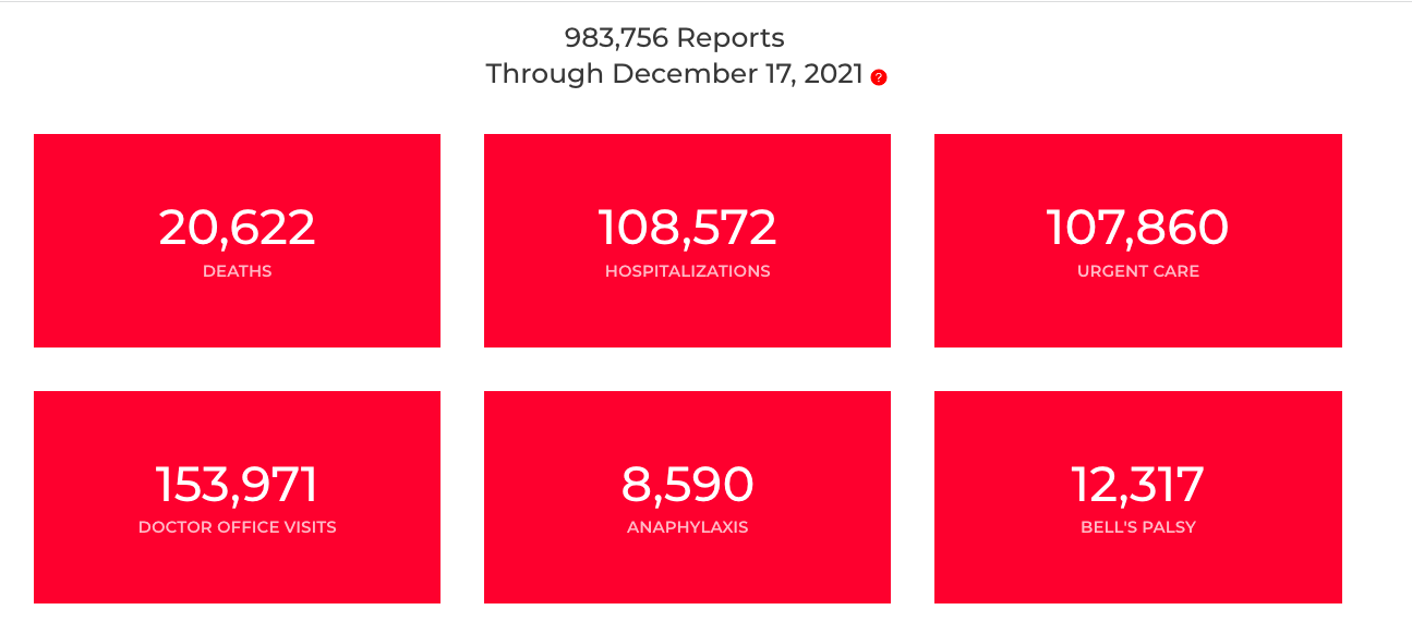 Accedemos a los Informes del Sistema de notificación de reacciones adversas a las vacunas de EEUU en https://openvaers.com/covid-data. Los reportes del VAERS incluyen 983.756 incidencias de las que 20.622 han tenido resultado en muerte. Incluimos 108.572 hospitalizaciones, 10.429 paros cardíacos, 3.365 abortos espontáneos, 20.560 miocarditis/pericarditis, 34.615 afectaciones clasificadas muy graves.