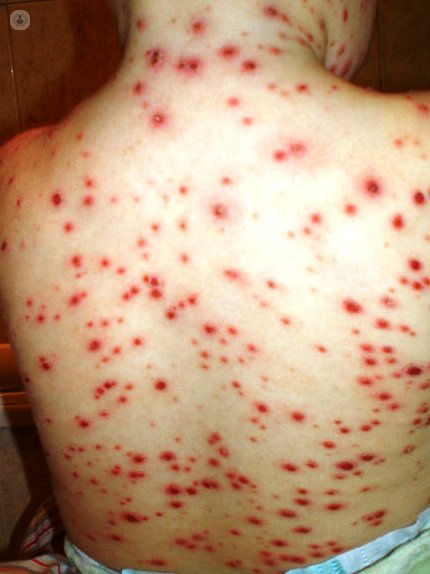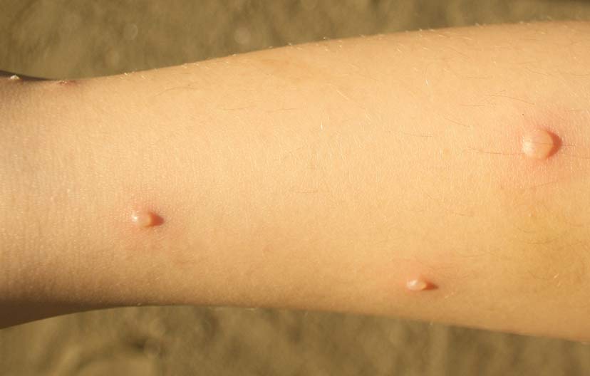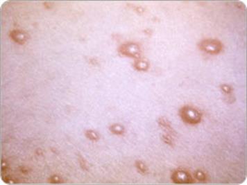 Fiebre, erupción cutánea e inflamación de los ganglios linfáticos, y puede provocar una variedad de complicaciones médicas. La erupción cutánea suele comenzar 1-3 días después de la aparición de la fiebre y tiende a concentrarse sobre todo en la cara y las extremidades en lugar de en el tronco. Las zonas más afectadas son el rostro (en el 95% de los casos), las palmas de las manos y las plantas de los pies (en el 75% de los casos). También se ven afectadas las mucosas orales (en el 70% de los casos), los genitales (30%) y las conjuntivas (20%), así como la córnea. La erupción evoluciona secuencialmente de máculas (lesiones con una base plana) a pápulas (lesiones firmes ligeramente elevadas), vesículas (lesiones llenas de líquido claro), pústulas (lesiones llenas de líquido amarillento) y costras que se secan y se caen. El número de lesiones varía de unas pocas a varios miles. En casos graves, las lesiones pueden unirse y hacer que se desprendan grandes secciones de piel.