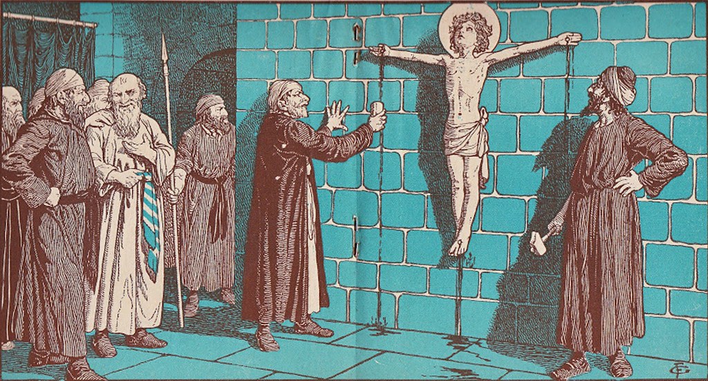 A la derecha del dibujo, representación del ficticio rabino que, además de protagonizar el rapto del infante, habría sido quien le clavó a un muro interior de la Sinagoga mayor, inmediata al callizo del Talmud, como delata el martillo que aún lleva en su mano derecha. Mientras tanto y a la izquierda, otros judíos parecen regodearse con el hecho, y uno de ellos porta una lanza que luego clavaría en el costado del niño.