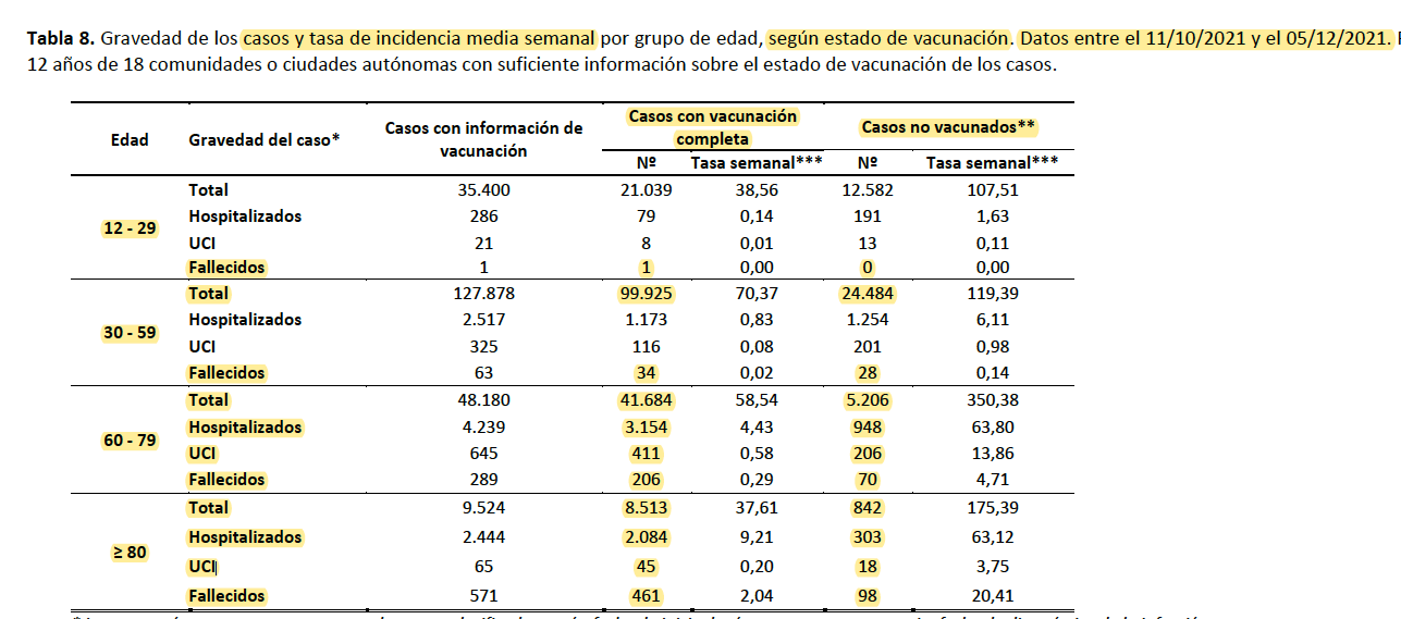 Examinamos el documento oficial del Ministerio de Sanidad con los casos y tasa de incidencia media semanal (entre el 11/10/2021 y el 05/12/2021) según edad, gravedad y estado de vacunación.